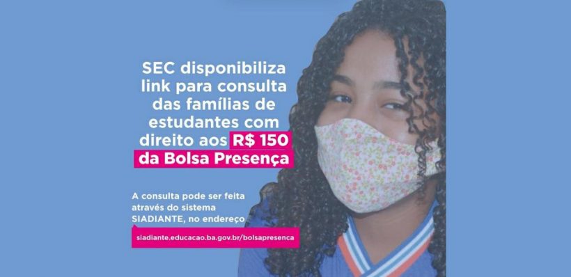 A Secretaria da Educação do Estado da Bahia (SEC) disponibilizou, nesta sexta-feira (9), um link para a consulta sobre o direito à Bolsa Presença. A iniciativa faz parte do programa Estado Solidário, do Governo do Estado, e concederá R$ 150 para as famílias dos estudantes em situação de vulnerabilidade socioeconômica, cadastradas no Cadastro Único (CaDÚnico). A Bolsa Presença visa promover a permanência dos alunos na escola, fortalecer a aprendizagem e estreitar a relação com a escola, durante este período de pandemia do novo Coronavírus.
