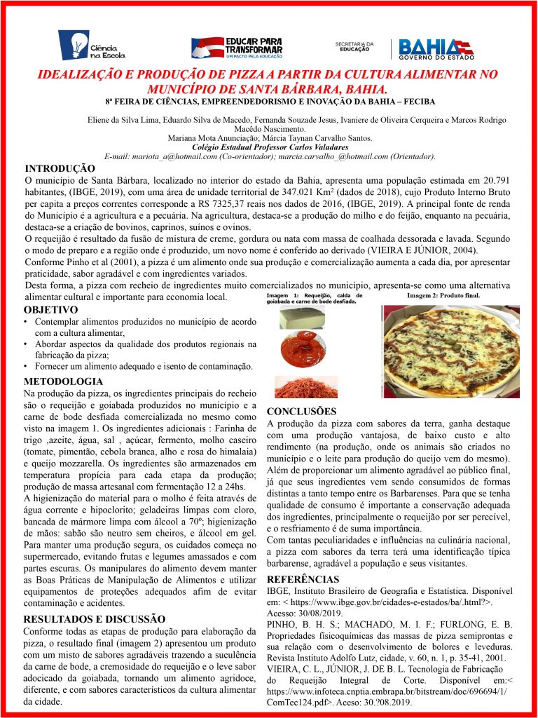 Idealização e Produção de Pizza a Partir da Cultura Alimentar no Município de Santa Bárbara Bahia. 12/10/202312/10/2023 CEPCV Projeto 02Idealização e Produção de Pizza a Partir da Cultura Alimentar no Município de Santa Bárbara Bahia.