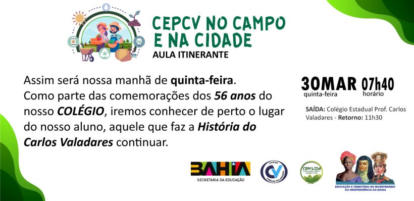 CEPCV realiza Aula Itinerante no Campo e na CidadeO Colégio Estadual Prof. Carlos Valadares (CEPCV), no município de Santa Bárbara, localizado no Território de Identidade do Portal do Sertão, realiza Aula Itinerante no Campo e na Cidade, como parte das comemorações dos 56 anos do nosso COLÉGIO, iremos conhecer de perto o lugar do nosso […]